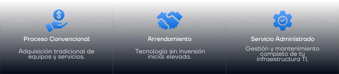 Ofrecemos esquemas de adquisición adaptados a tus necesidades: compra tradicional, arrendamiento y servicio administrado, brindándote flexibilidad para optimizar tu infraestructura TI.