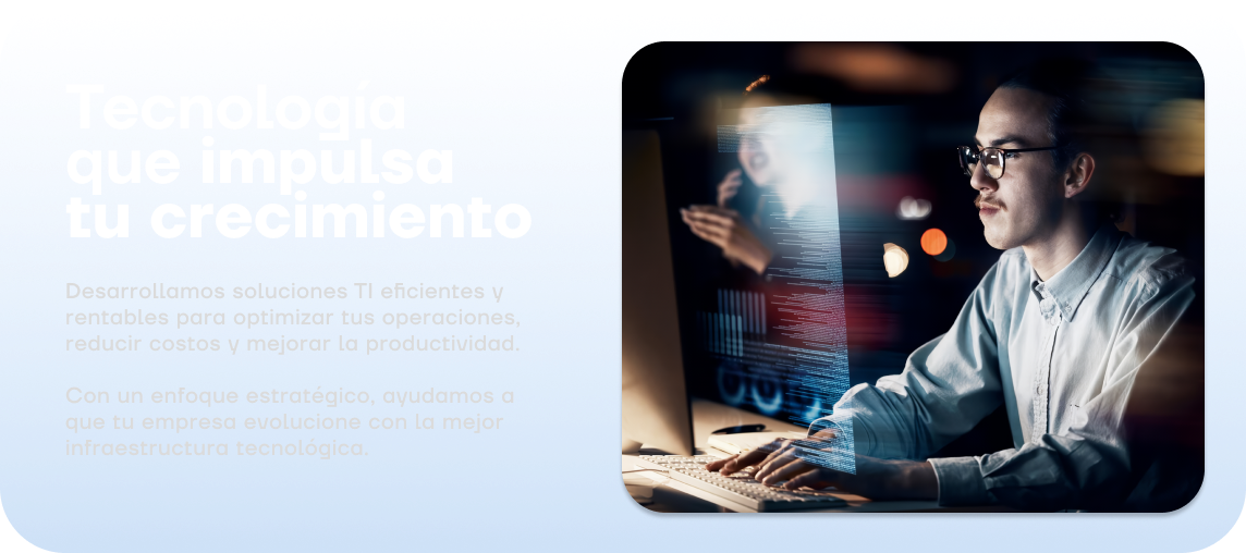 Diseñamos e implementamos infraestructuras tecnológicas eficientes, escalables y seguras. Desde procesamiento y almacenamiento hasta conectividad y seguridad, ofrecemos soluciones a la medida para optimizar el rendimiento de tu empresa.